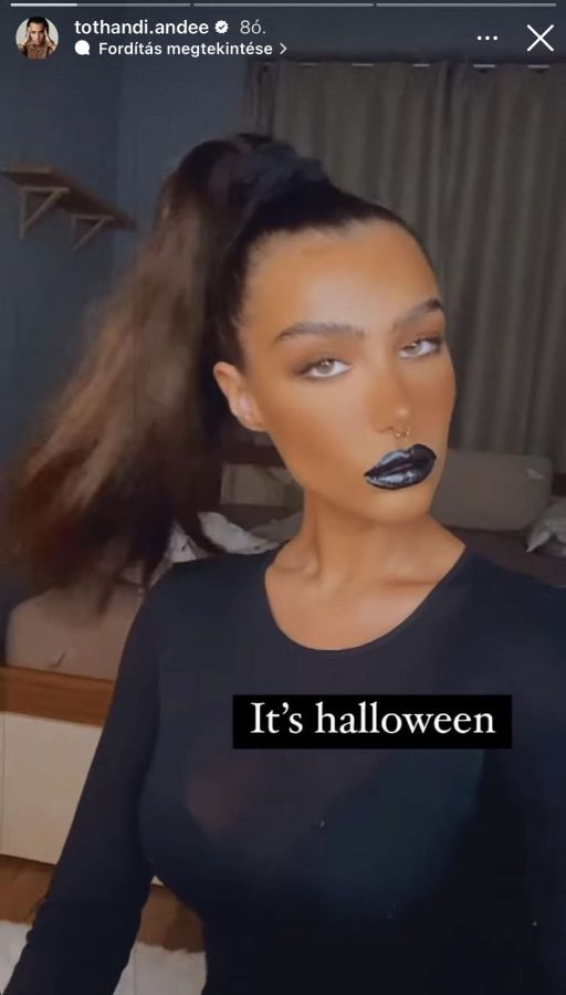 A 24 óráig elérhető Instagram-történetében Andi megosztott egy fotót, melyen telt ajkait feketére festette a különleges színű rúzsa, haját copfba fogta, s hozzá egy fekete felsőt választott, így a halloweeni jelmeze igazán sötétre sikeredett.Önnek hogy tetszik az énekesnő megjelenése?